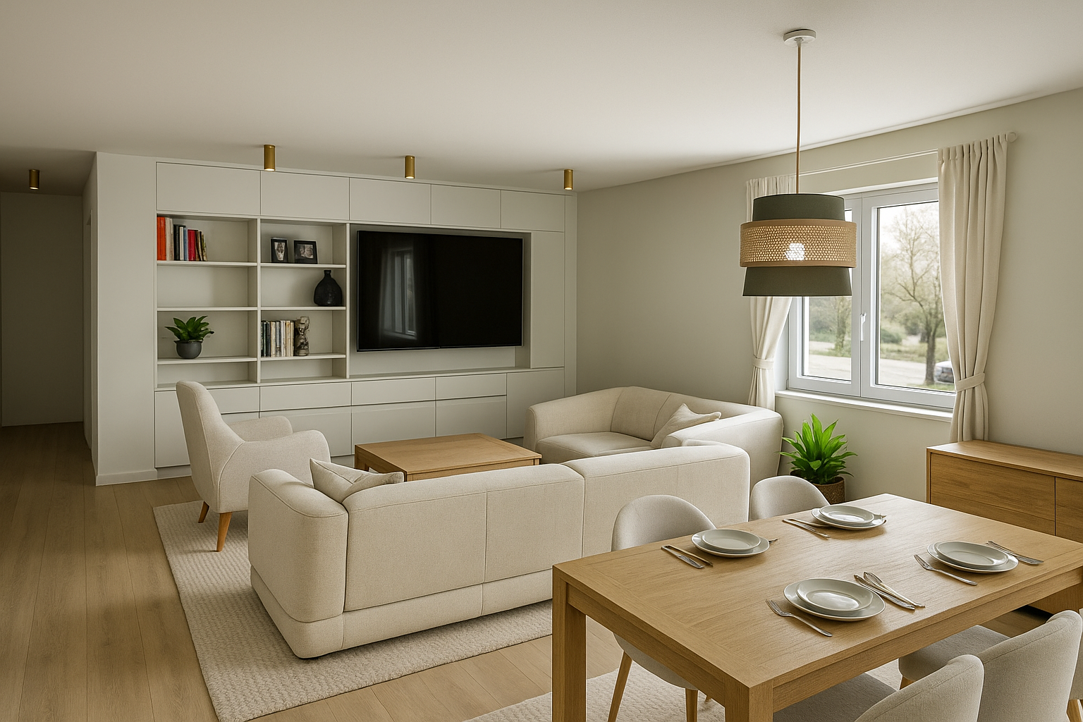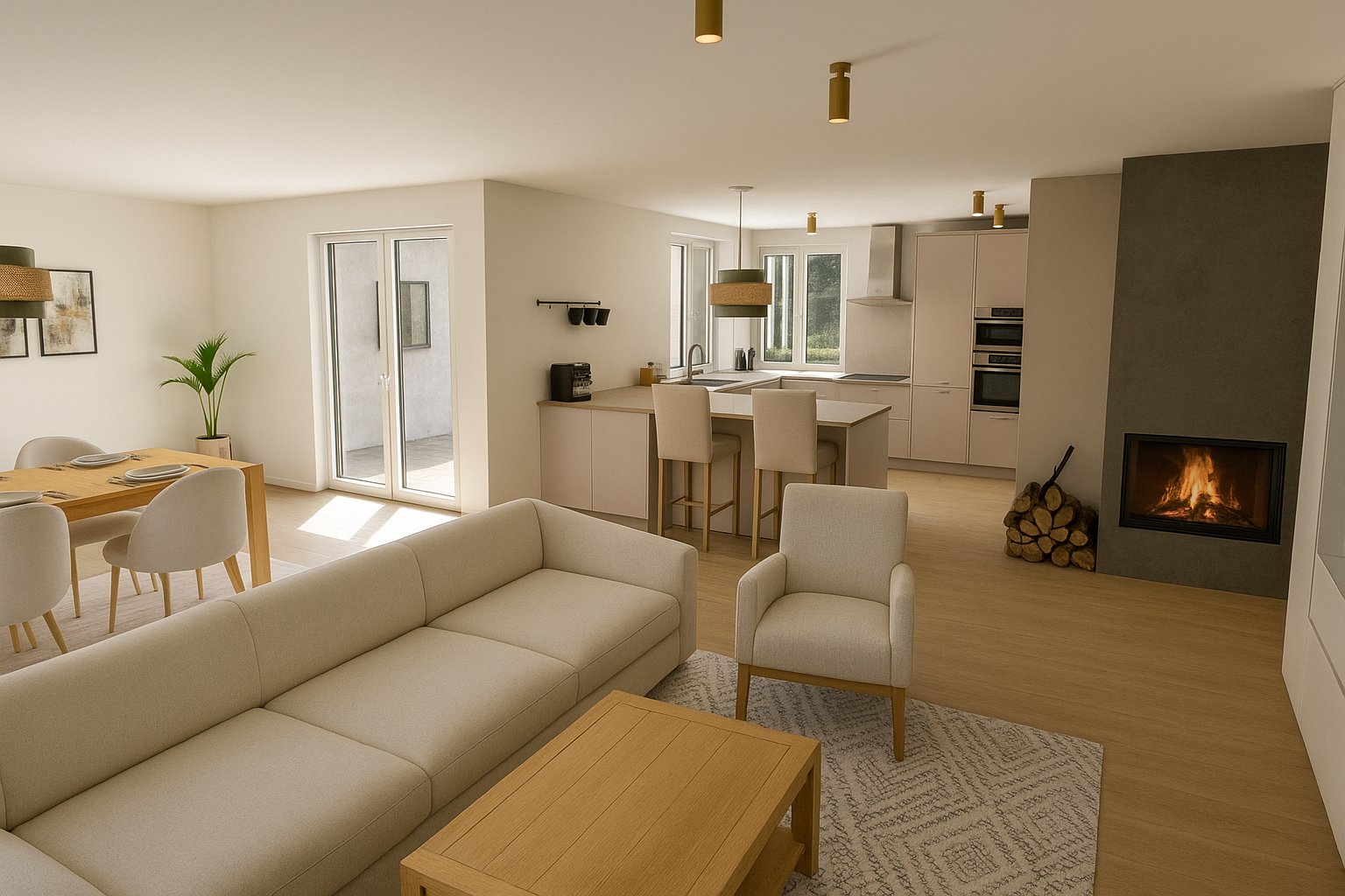 Dispozícia domu je praktická a veľmi priestranná, s dostatkom svetla a logickým oddelením dennej a nočnej časti. Veľká obývacia izba prepojená s kuchyňou vytvára príjemný centrálny priestor pre rodinu, zatiaľ čo dve samostatné izby poskytujú súkromie a flexibilitu – či už pre deti, hostí alebo domácu kanceláriu.